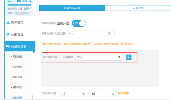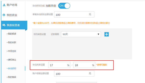 (6)【预期年化利率设置】时,输入您期望投资项目的预期年化利率区间(即对应项目类型设置,例如90天的项目最高预期年化利率为17.6%,可以将预期年化利率设置为17%-18%)