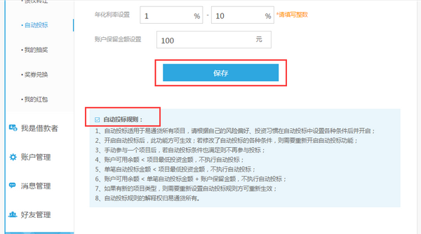 (7)【账户保留金额设置】需要输入的是您的账户能够保留多少资金不参与自动投标