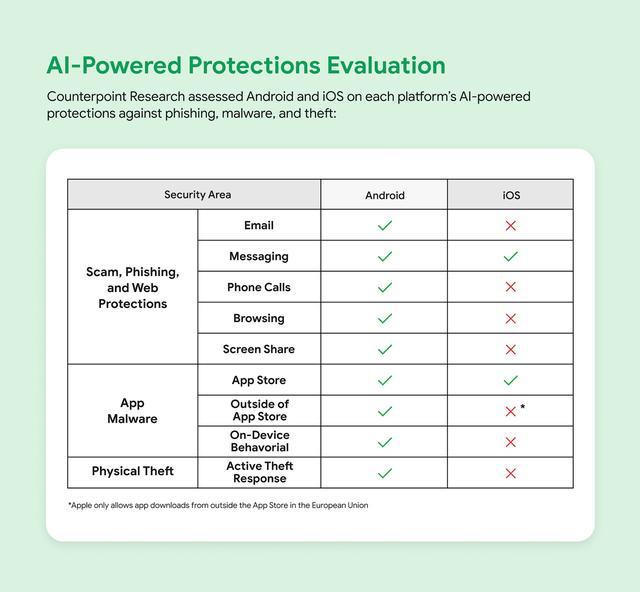 研究机构 Counterpoint Research 的一份报告指出,安卓设备可在九个关键安全层面上提供基于 AI 的防护,而 iPhone 仅覆盖了其中两个。
