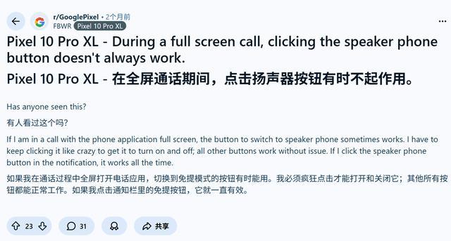 部分用户发现,需要快速、反复地多次点按该按钮,才能侥幸开启扬声器。一位 Pixel 10 Pro XL 用户沮丧地表示,每次想从听筒切换到扬声器时,都必须“狂点”屏幕好几次,这种糟糕的体验在日常通话中造成了极大不便。
