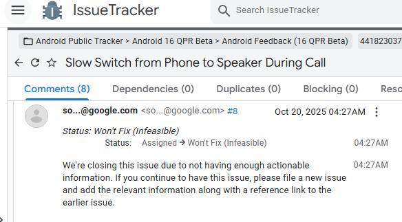 然而,截至目前,谷歌不仅没有发布任何修复补丁,反而以“缺少可操作信息”为由关闭了该报告。面对这个延续了两代产品、严重影响基础通话体验的 Bug,谷歌的消极处理态度正持续引发用户的不满与质疑。