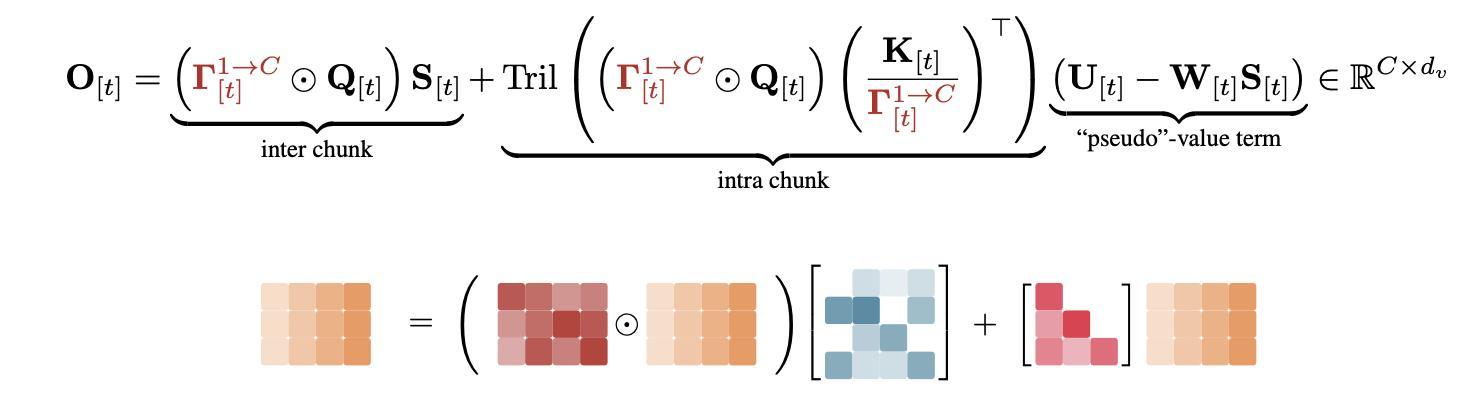 论文中介绍了KDA的分块并行化,展示了如何在对角门控下保持稳定性的同时,将一系列秩为1的矩阵变换压缩成稠密表示,在输出阶段,研究人员采用块间递归和块内并行策略来最大化矩阵乘法吞吐量,从而充分利用张量核心的计算潜力。