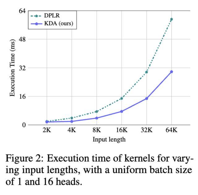通过将变量a和b都绑定到k,KDA有效地缓解了这一瓶颈,将二级分块矩阵计算的次数从四次减少到两次,并进一步消除了三次额外的矩阵乘法。因此,与DPLR公式相比,KDA的算子效率提高了约100%。