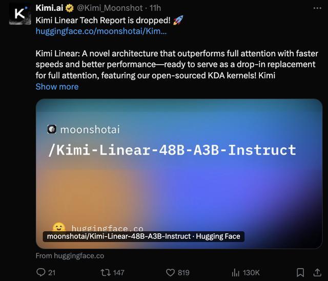 Kimi开源了KDA内核和vLLM的实现,并发布了预训练和指令调优的模型检查点。