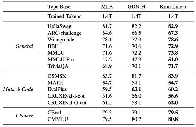 研究人员评估了Kimi Linear模型与全注意力MLA基线、混合门控DeltaNet(GDN-H)基线的性能,所有基线均采用相同的架构、参数数量和训练设置。