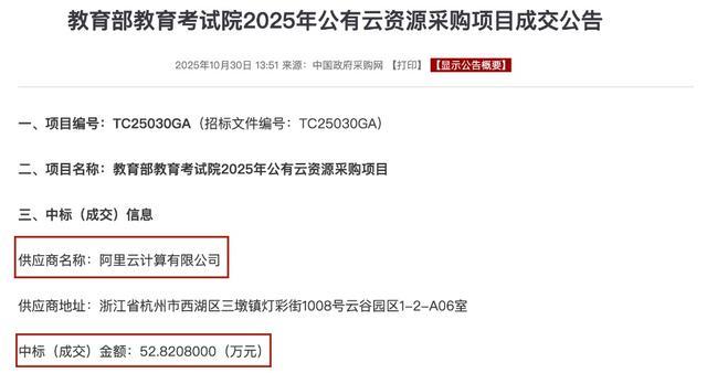 10月30日,阿里云还中标了教育部教育考试院2025年公有云资源采购项目,中标报价为52.82万元。