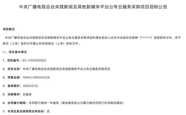 本月,阿里云还拿下了一个亿级项目。2025年10月24日,中央广播电视总台《央视新闻及其他新媒体平台公有云服务采购项目》发布中标公告,供应商为央视国际网络有限公司,中标报价为1.089亿元,供应商将提供1530台阿里云云服务器。