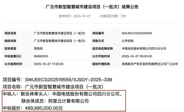 智东西10月31日消息,10月27日,广元市新型智慧城市建设项目(一批次)中标结果公示,中国电信四川分公司牵头,联合阿里云计算有限公司一同中标,中标报价为8988万元。