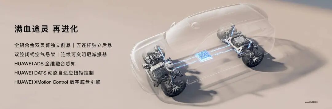新款 M7 的前悬架,从老款的麦弗逊式,升级为了成本更高、结构更复杂的双叉臂式独立悬架,并且集成了「满血」华为途灵平台的 ADS 全维融合感知、DATS 动态扭矩控制等核心技术,在高速过弯和经过颠簸路面时,车身的姿态会更从容,滤震也更干净。