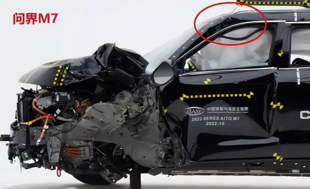 标志性的事件就是在中保研进行的一次 25% 偏置碰撞测试中,问界 M7 A 柱与车顶连接处疑似发生变形,在「乘员舱上部入侵量」、「车辆结构」两项测评中仅获得「良好」,而车价仅一半的竞品车型都是「优秀」。