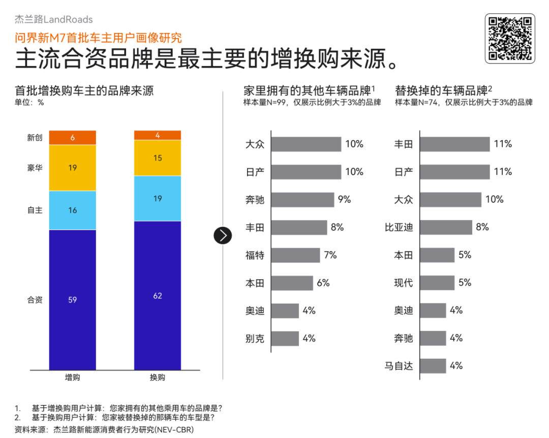 咨询机构杰兰路曾经做过一份调查,问界新车的首批车主中,家庭换购和增购的比例加起来在 60%-70%,被替换掉的车型几乎全为油车。