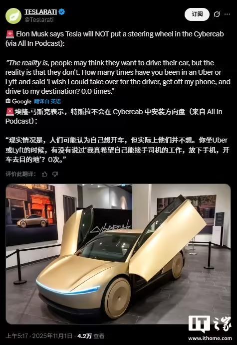 IT之家 11 月 2 日消息,特斯拉 Cybercab 是一款以自动驾驶为核心的汽车,然而近期外界对于该车型的配置产生了诸多猜测,尤其是其是否将配备传统的方向盘和踏板。