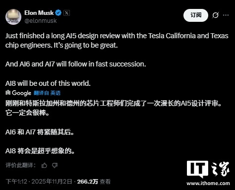 IT之家 11 月 2 日消息,特斯拉公司首席执行官埃隆・马斯克(Elon Musk)今日在其社交媒体平台 X 上透露,特斯拉已经完成了 AI5 芯片的设计评审,并对其未来表现充满信心。此外,马斯克还透露了 AI6 和 AI7 芯片的研发计划,以及对 AI8 芯片的极高期待。