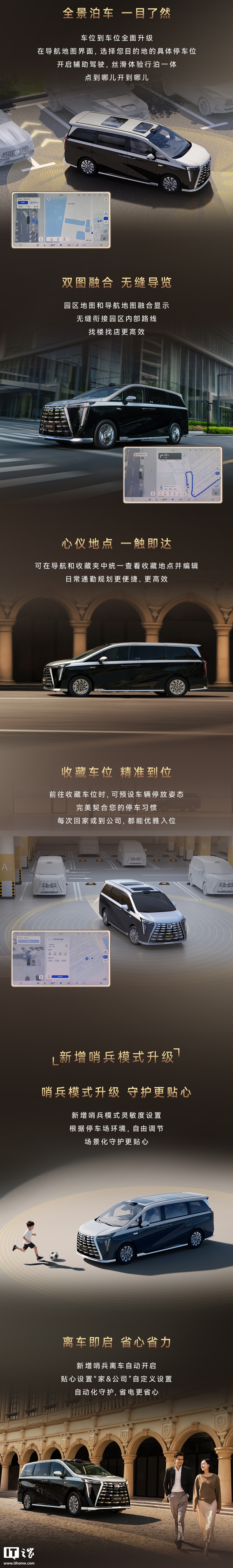IT之家 11 月 2 日消息,华为乾崑智能汽车解决方案官方微博昨日宣布,广汽传祺向往 M8 车型华为乾崑智驾 ADS 4 全面推送,实现架构、安全、体验三大维度升级,同时新增全景泊车、园区导航双地图融合显示等六大功能。