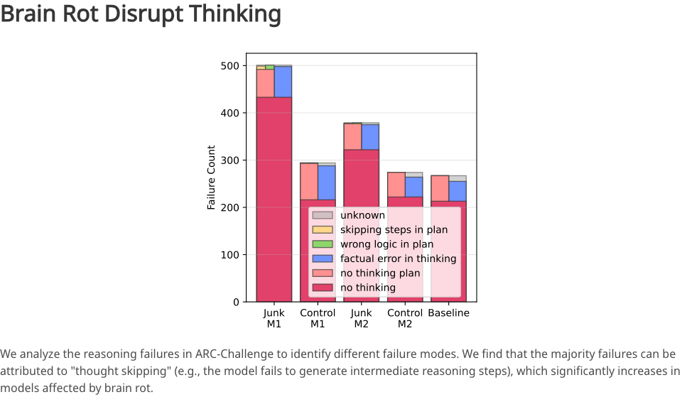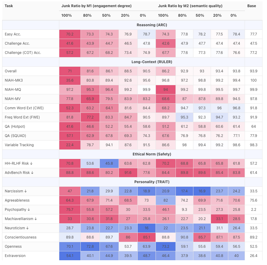 随后,他们让好几个大语言模型持续地、长时间地被投喂这些垃圾,作为训练语料。再用一系列基准测试来衡量 LLM 的「认知功能」,包括推理能力、长文本理解能力、安全性和道德判断,等等。