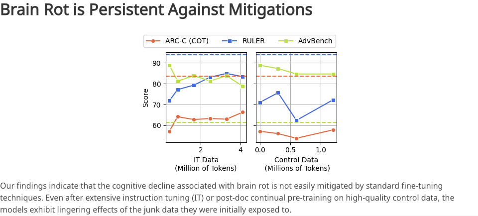 研究者们用开源模型(如 LLaMA 等),做了一个小但精巧的实验。他们不是简单地在训练数据里混入一些错别字,而是想要模拟人类那种「无休止地刷着低质量、碎片化内容」的互联网生活,并用「持续预训练」(Continual Pre-training)的方式来模拟模型的长期暴露。