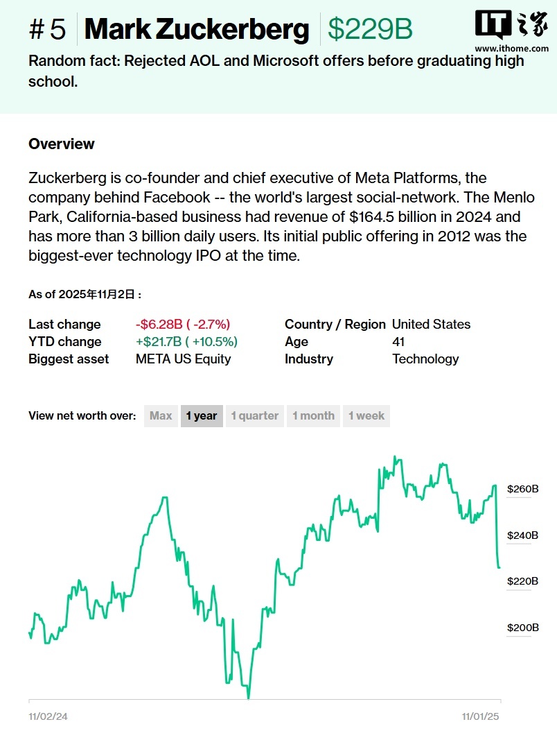 IT之家 11 月 2 日消息,在周四 Meta 股价暴跌超 11% 之后,马克・扎克伯格(Mark Zuckerberg)在彭博亿万富豪指数(Bloomberg Billionaires Index)中的排名从第三位降至第五位,其个人财富单日缩水 292 亿美元(IT之家注:现汇率约合 2079.49 亿元人民币)。
