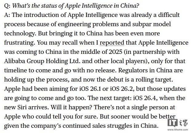 古尔曼指出,Apple Intelligence 的整体研发过程本就面临技术难题,包括工程问题与模型性能不佳等,而其在中国的部署则更加复杂。