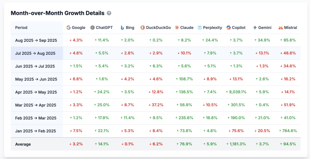 比如,Ahrefs 发布过一个结果( 如下图 ),在过去 9 个月时间内,谷歌的网站流量贡献每月平均下跌 3.2%,其他 AI 工具对网站流量的贡献则快速增长,比如除谷歌外用户量最高的 ChatGPT 每月平均增长量达到 14.1% 。
