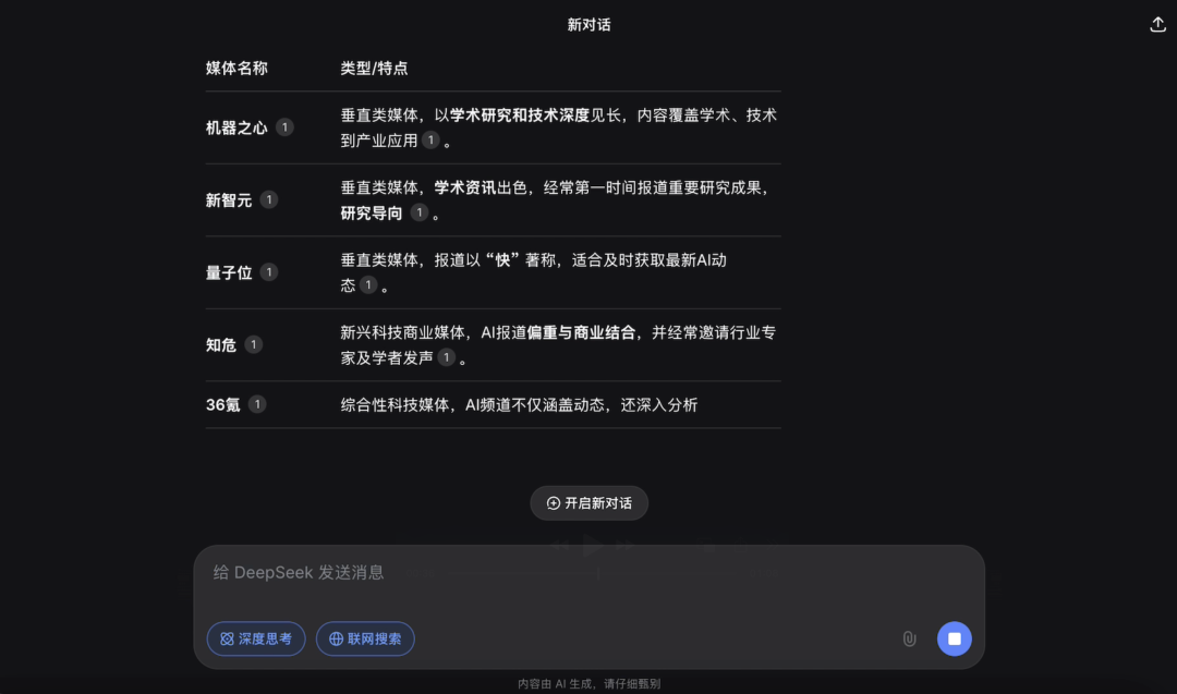 但当你去 DeepSeek 提问 “ 想了解AI可以看哪些媒体?” 并打开联网搜索和深度思考时,会得到这样的回答: