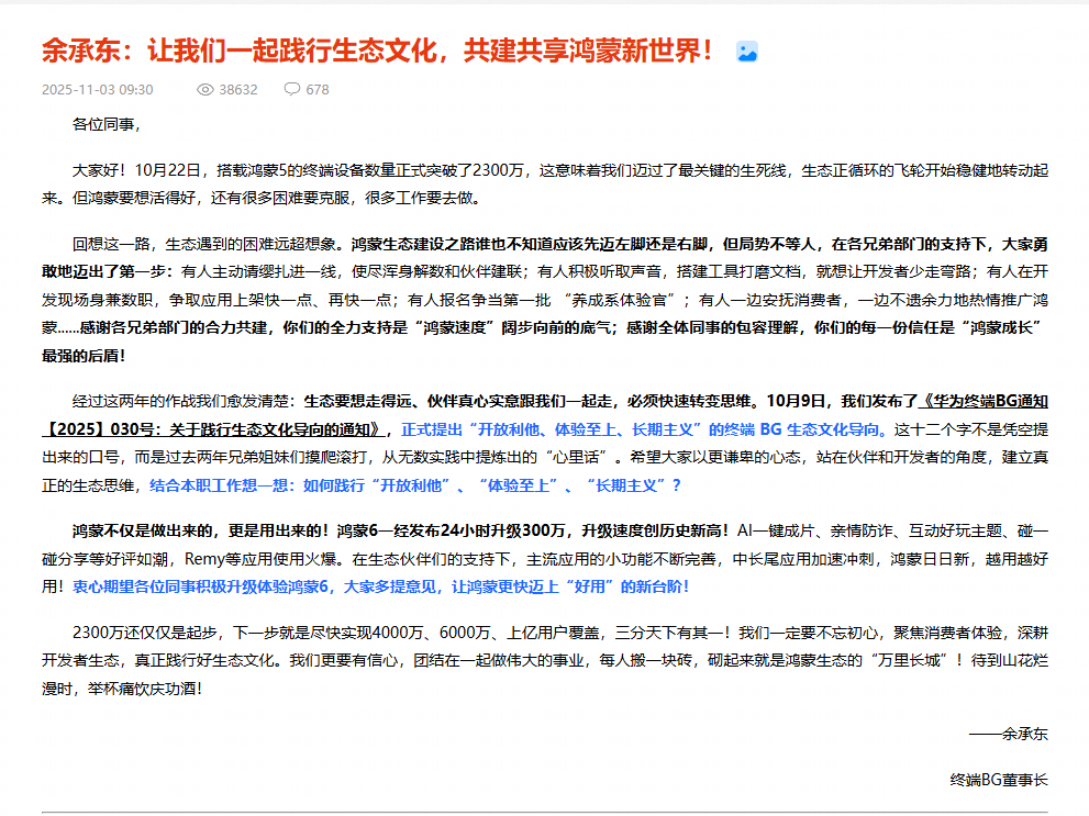 他在信中透露了原生鸿蒙的关键进展:10月22日,搭载鸿蒙5(即原生鸿蒙,HarmonyOS NEXT)的终端设备数量正式突破了2300万。
