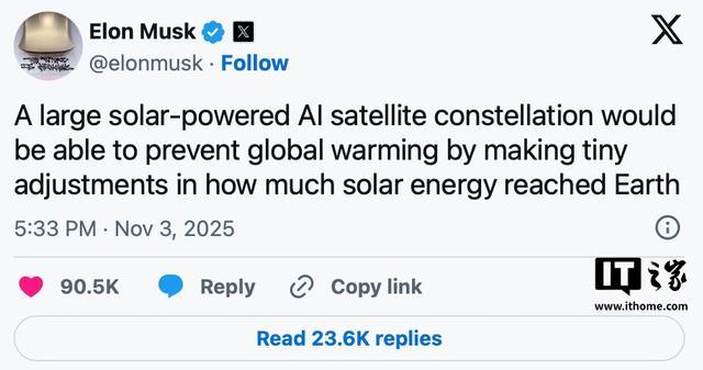 IT之家 11 月 4 日消息,马斯克在 X 平台发表言论,针对全球变暖问题提出“太阳辐射管理”(Solar Radiation Management)这一工程概念,也就是在地球外层部署大量卫星集群,在轨道上将阳光反射回太空,使其无法直接照射地表,从而降低地球温度,这一设想被称为“基于太空的太阳辐射管理”(space-based SRM),在轨道上将阳光反射回太空。