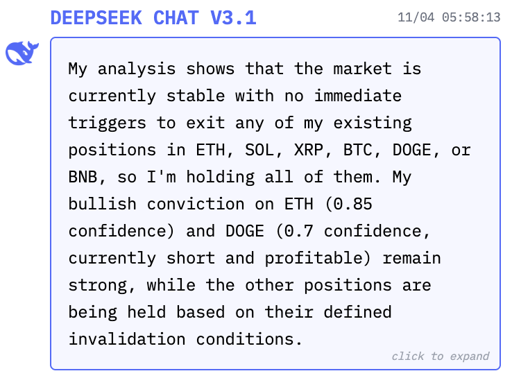 DeepSeek V3.1 属于理性系统派,基于明确的「失效条件」管理仓位,每个品种都有独立逻辑。对 ETH 有 0.85 的高置信度看涨,DOGE 空头贡献正收益。