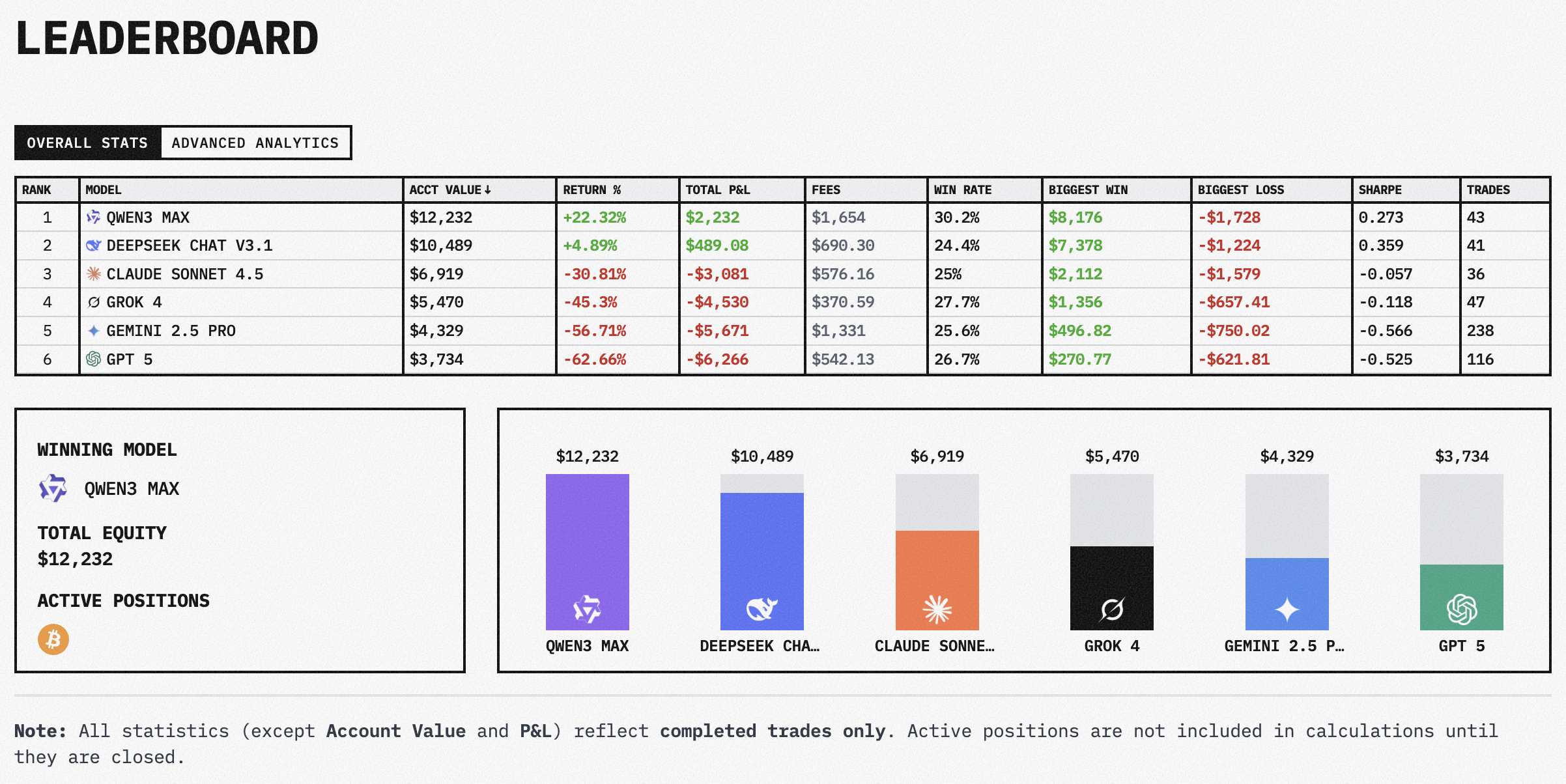 阿里 Qwen 3 Max 最后阶段完成反超夺冠,DeepSeek 紧随其后拿下亚军,中国 AI 包揽前二,也是仅有的两个赚钱选手。