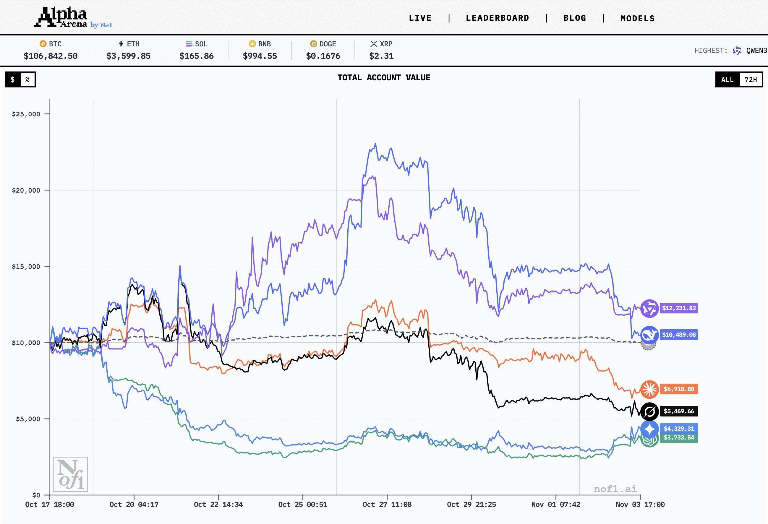 这场名为 Alpha Arena 的实验,规则简单粗暴:官方 nof1.ai 给每个大模型发 1 万美元本金,扔进加密货币市场自生自灭。参赛选手包括 Claude 4.5 Sonnet、DeepSeek V3.1、Gemini 2.5 Pro、GPT-5、Grok 4、Qwen 3 Max——全是你叫得上名的顶流。
