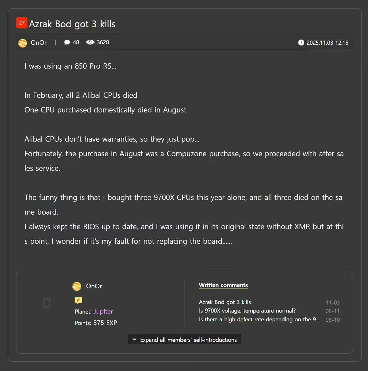 然而,经华擎方面确认,该主板被判定为“无故障”并返还。为了排除 CPU 来源问题,用户随后从韩国官方渠道购买了第三颗锐龙 7 9700X,但悲剧再次重演,这颗全新的 CPU 同样被烧毁。