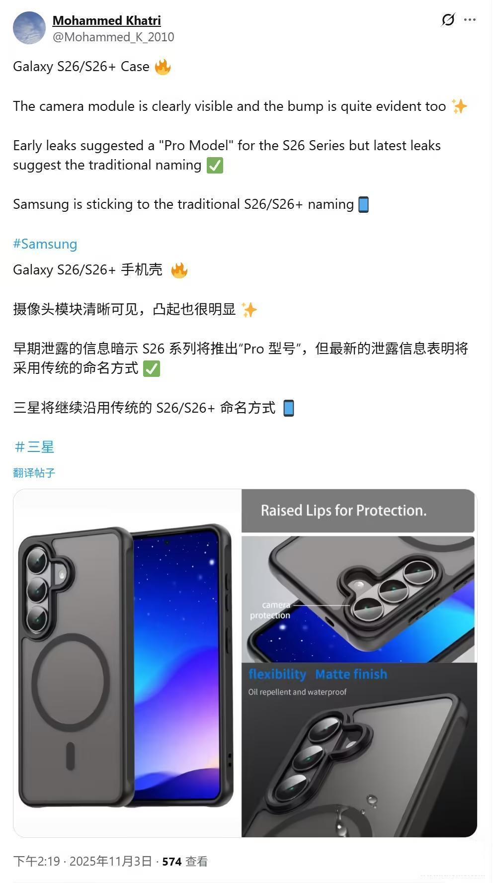 IT之家 11 月 4 日消息,消息源 Mohammed Khatri 昨日(11 月 3 日)在 X 平台发布推文,分享了一组来自配件厂商的渲染图,展示了三星 Galaxy S26 标准版佩戴手机壳后的效果。