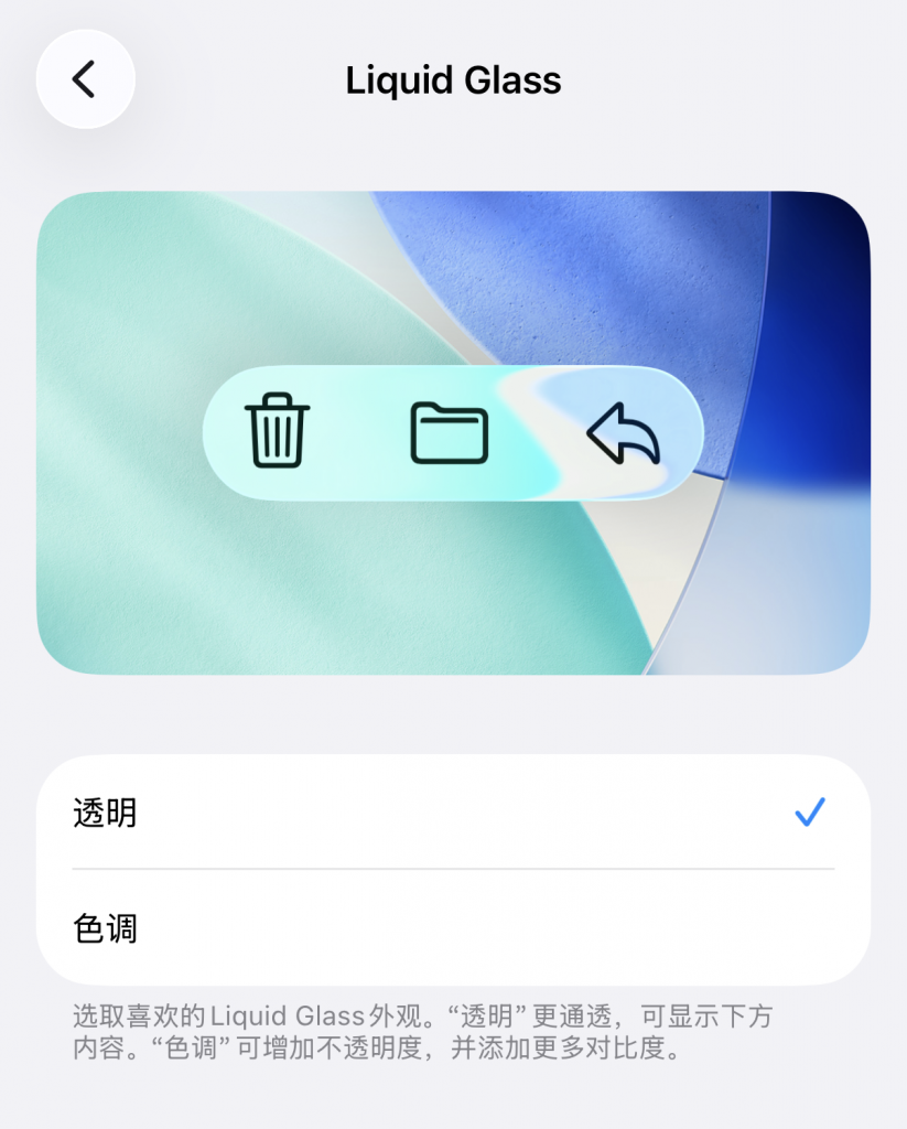 所以,苹果干脆在 iOS 26.1 提供选择,让用户可以自行选择液态玻璃的对比度,不过目前只能从「透明」和「色调」两个档位调节。