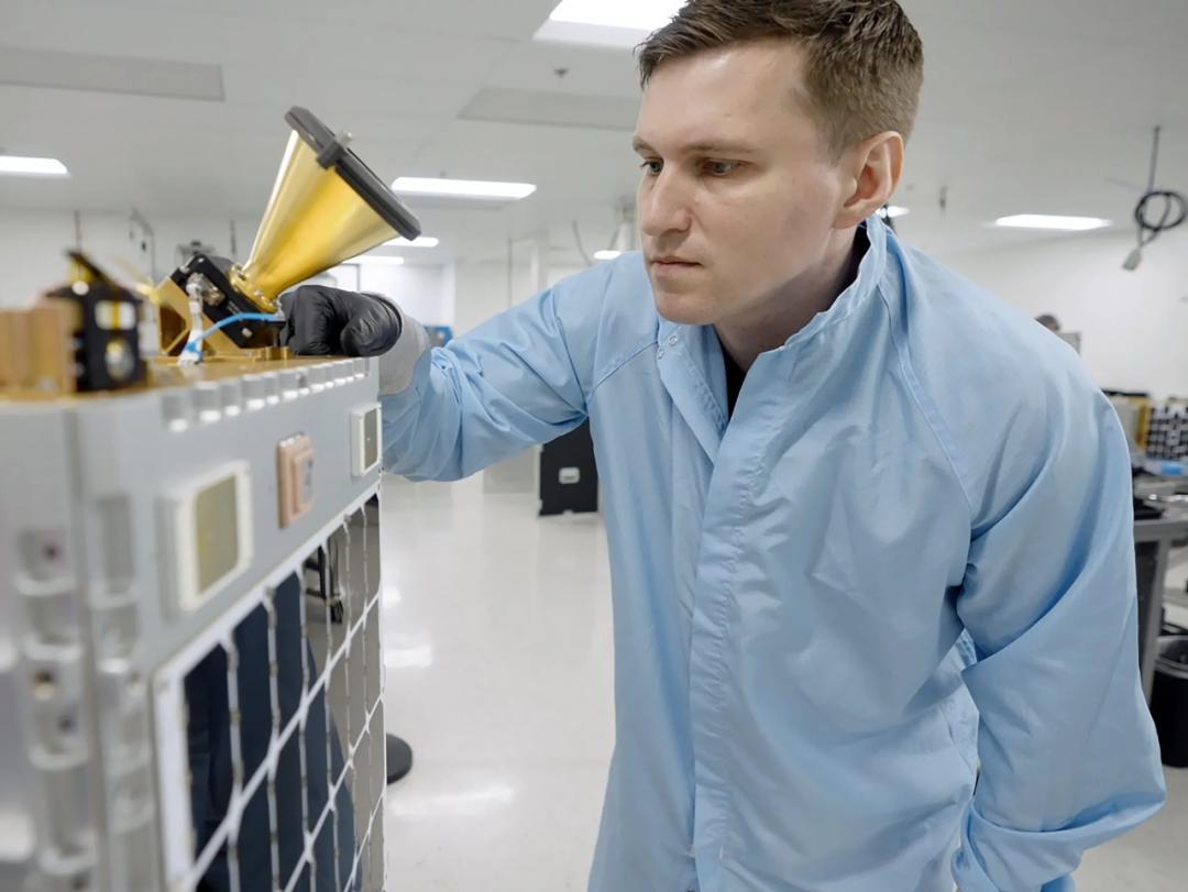 Starcloud 联合创始人、CEO Philip Johnston 正在检查用于卫星定向的星敏感器。