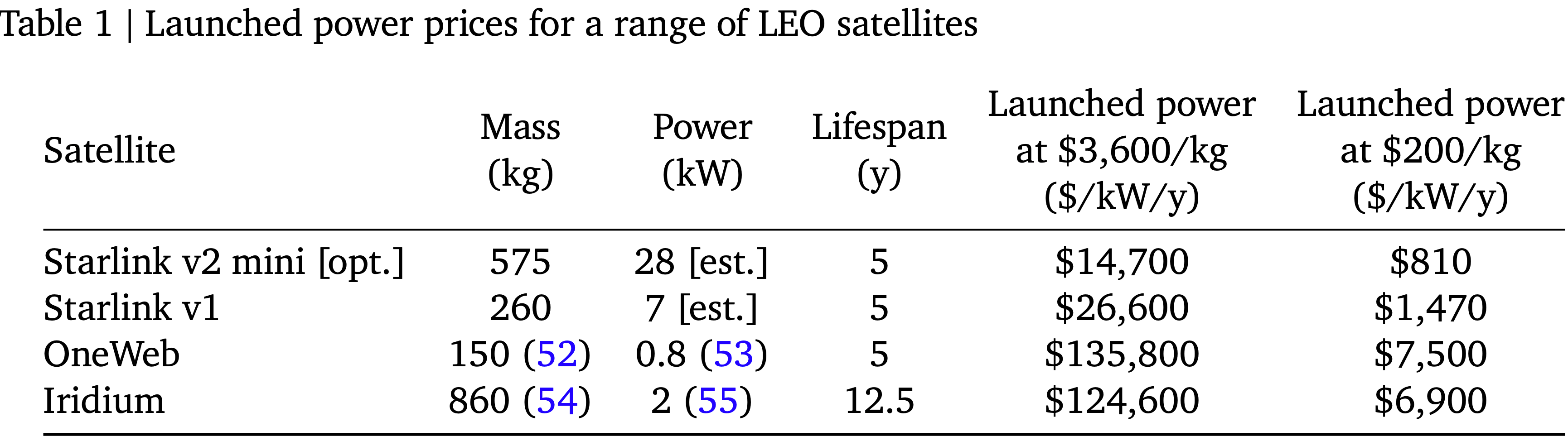 Google 在论文中计算过一笔账,如果 SpaceX 的发射成本能降到 $200/kg(预计 2035 年左右),则太空数据中心的单位功率成本,能与地面数据中心持平,约 $810/kW/年,与美国本土数据中心的 $570–3000/kW/年区间完全重叠。