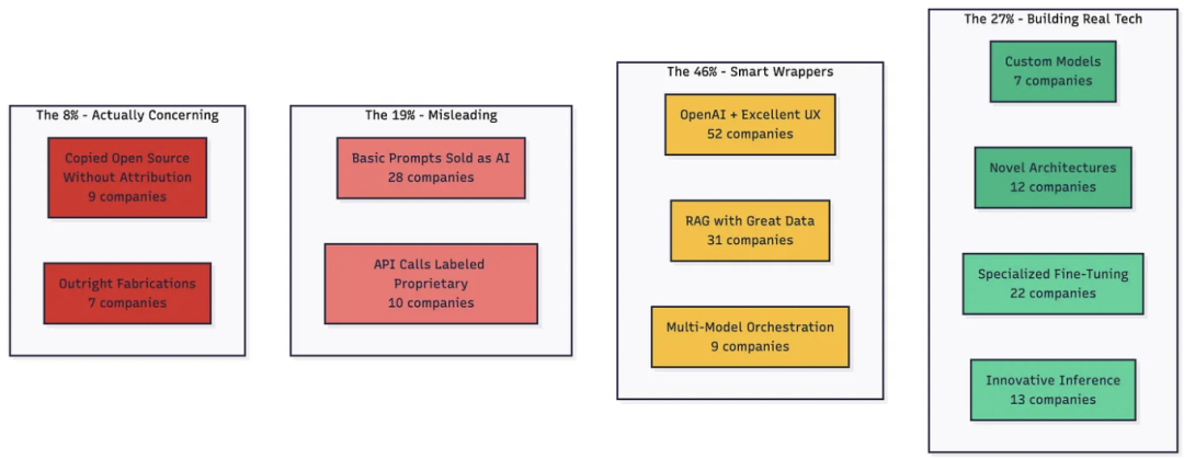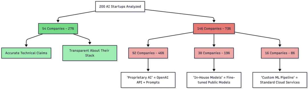 如今,一位软件工程师 Teja Kusireddy 用数据扯开了这场“繁荣”背后的部分真相。他对 200 家 AI 公司进行了逆向工程、反编译代码,并追踪 API 调用,发现许多号称“颠覆性创新”的公司,其核心功能仍依赖第三方服务,只是在外层多套了一层“创新”的壳。市场宣传与实际情况之间的差距令人震惊。