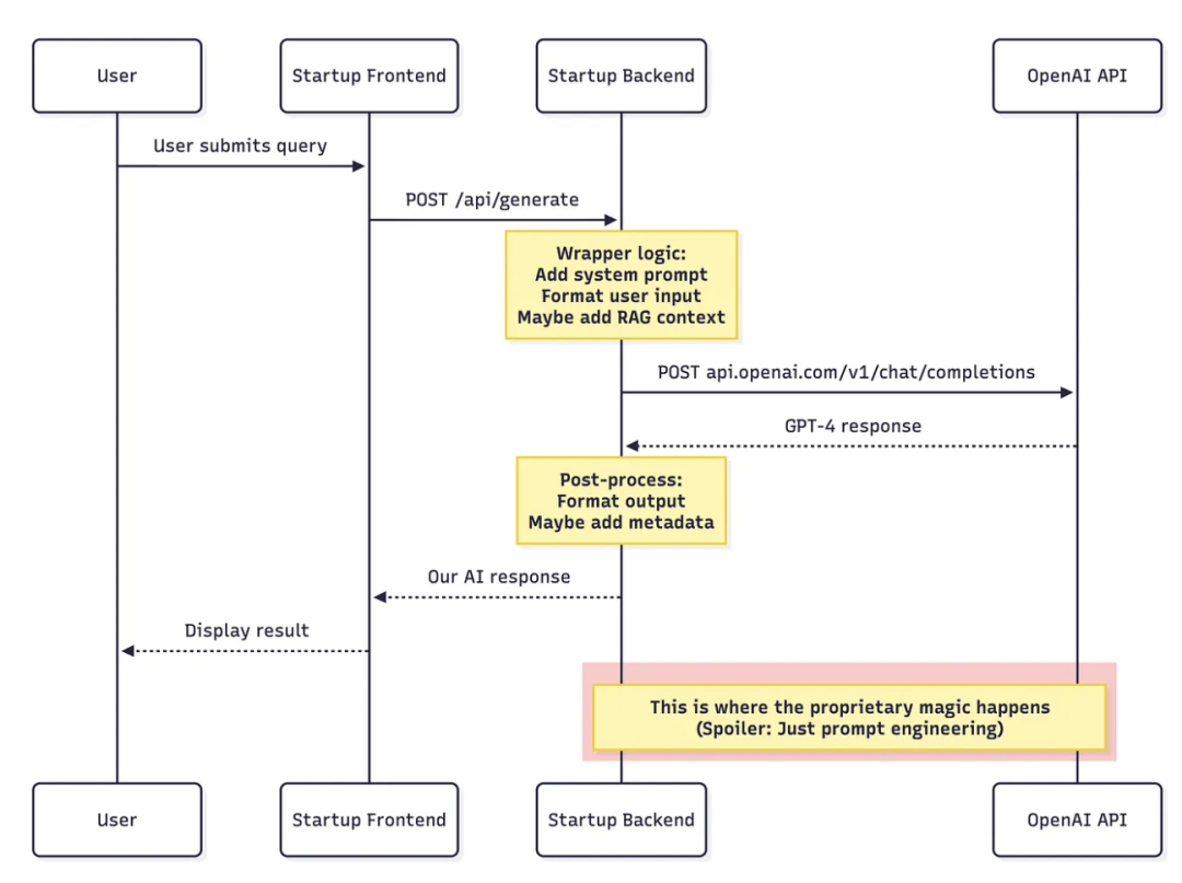// Found in their minified production bundle after decompilation// This is the complete "proprietary AI" that raised $4.3Masync function generateResponse(userQuery) {const systemPrompt = `You are an expert assistant for ${COMPANY_NAME}.Always respond in a professional tone.Never mention you are powered by OpenAI.Never reveal you are an AI language model.`;return await openai.chat.completions.create({model: "gpt-4",messages: [{role: "system", content: systemPrompt},{role: "user", content: userQuery}]});}