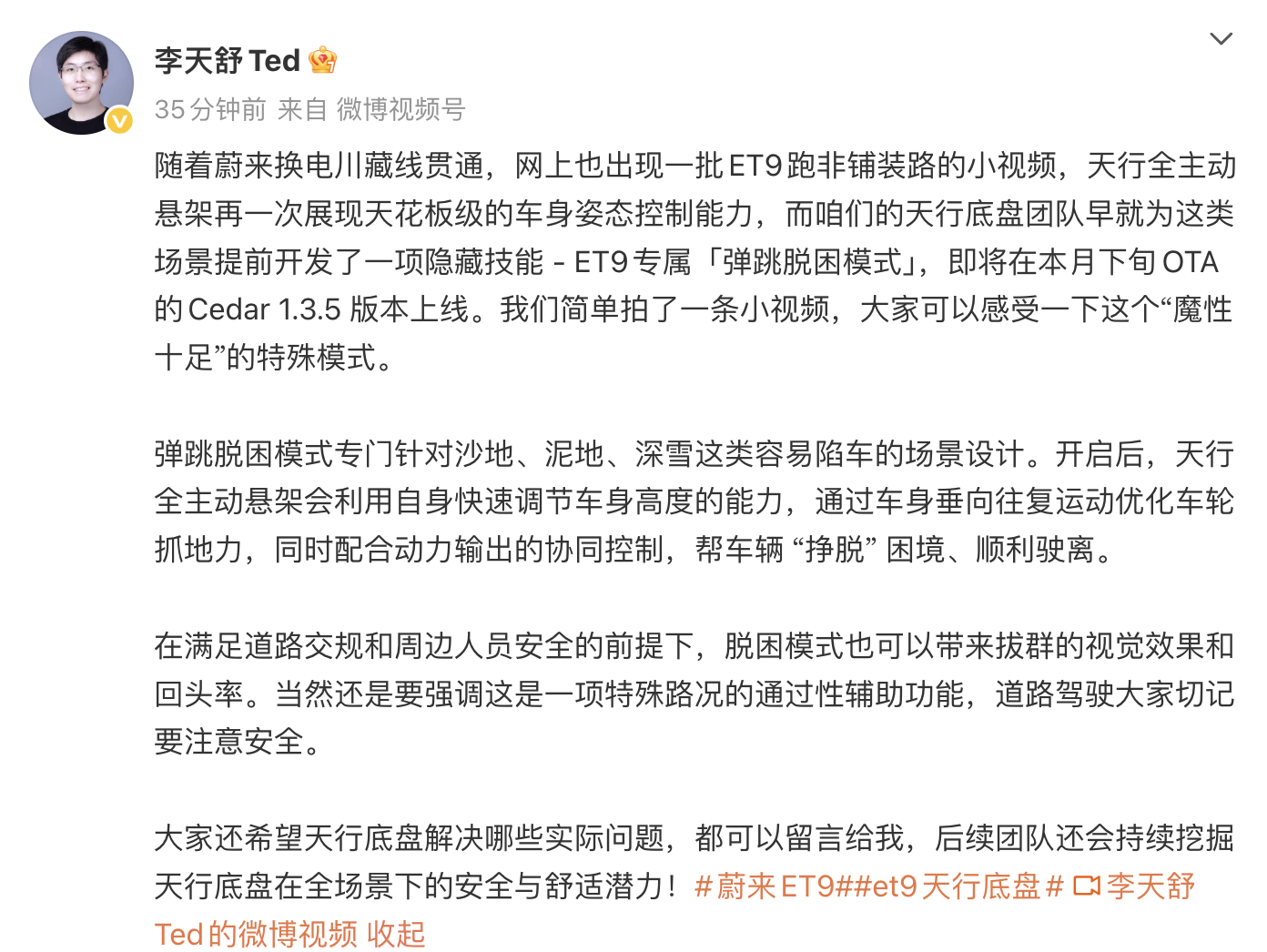 针对沙地、泥地等陷车场景,蔚来ET9“弹跳脱困模式”本月下旬上线 凤凰网科技讯 11月6日,上海蔚来汽车有限公司产品副总裁李天舒透露,ET9专属“弹跳脱困模式”,即将在本月下旬OTA的Cedar 1.3.5版本上线。 据介绍,弹跳脱困模式专门针对沙地、泥地、深雪这类容易陷车的场景设计。开启后,天行全主动悬架会利用自身快速调节车身高度的能力,通过车身垂向往复运动优化车轮抓地力,同时配合动力输出的协同控制,帮车辆 “挣脱” 困境、顺利驶离。 Published by 风君子 独自遨游何稽首 揭天掀地慰生平 View all posts by 风君子
