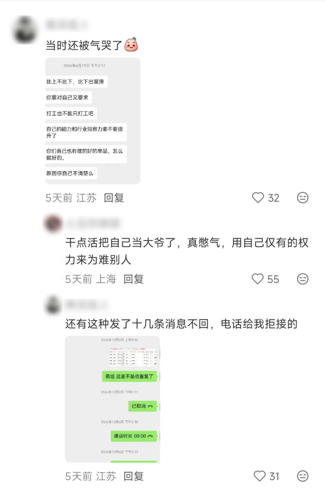 一位自称商家运营的用户还贴出自己与采销的聊天记录,并表示遭遇了采销“比上不比下,比下出溜滑”“你要对自己有要求”“打工也不能只打工吧”“自己的能力和行业洞察力要不要提升了”的一连串诘问,自己当时就被气哭了。
