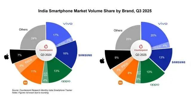 从数据看,小米在印度的市场份额已大幅缩水。2024年三季度还占11%,到2025年三季度只剩8%,相比高峰期直接腰斩。这背后,是小米从“积极扩张”到“摆烂摸鱼”的转变。