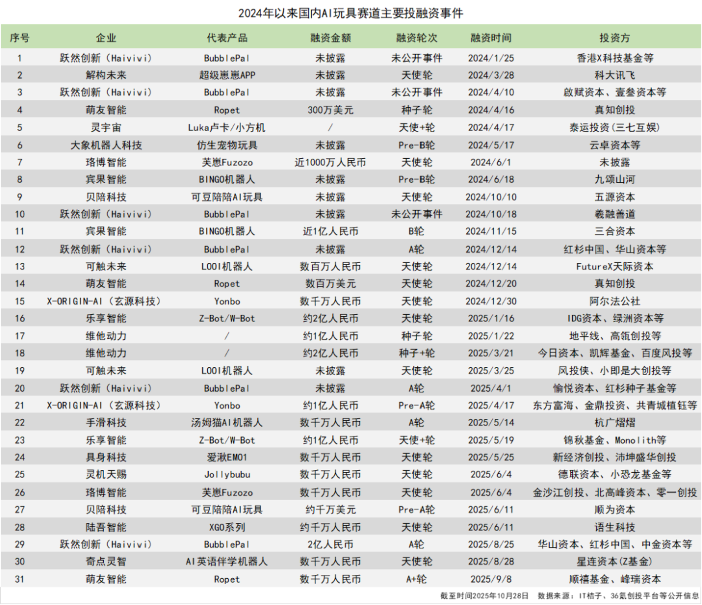 据蓝鲨财经社不完全统计,2024年至今,国内AI玩具赛道已发生至少31起投融资事件,其中2025年以来的主要投融资就有16起,且不乏多起亿级、千万级投资,投融资数量和金额双增长。