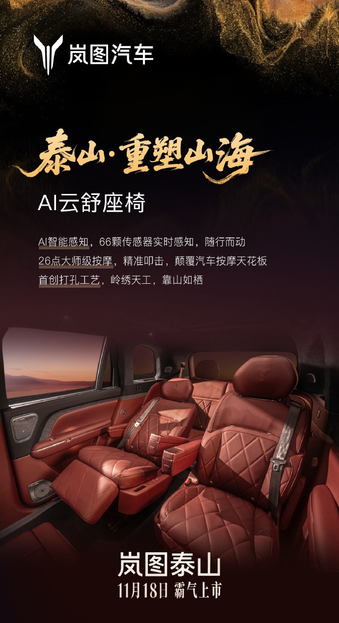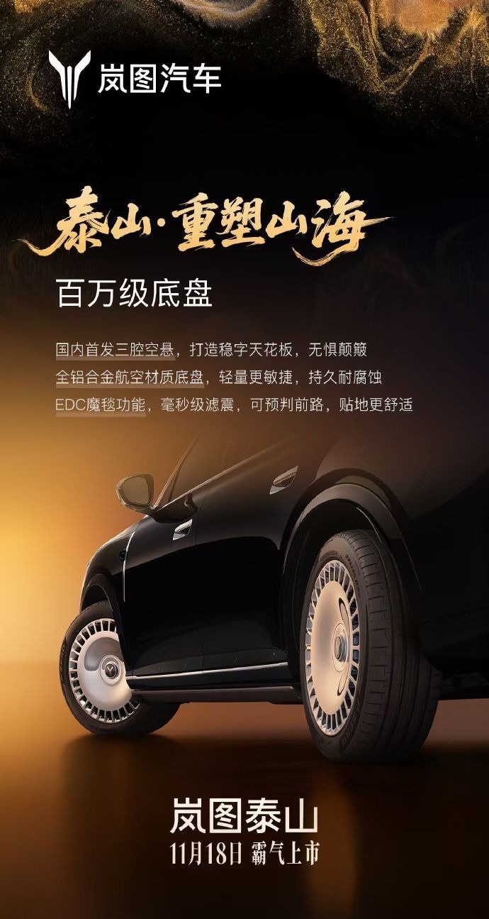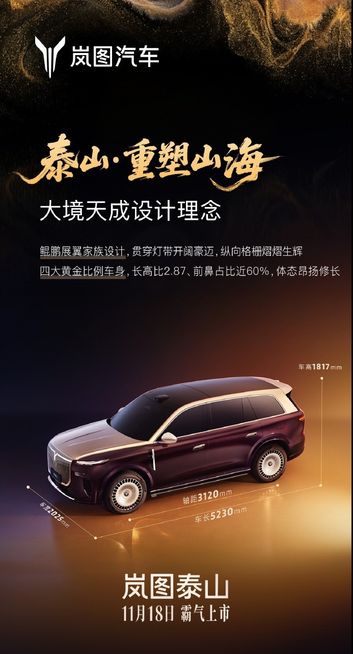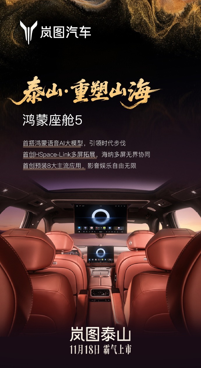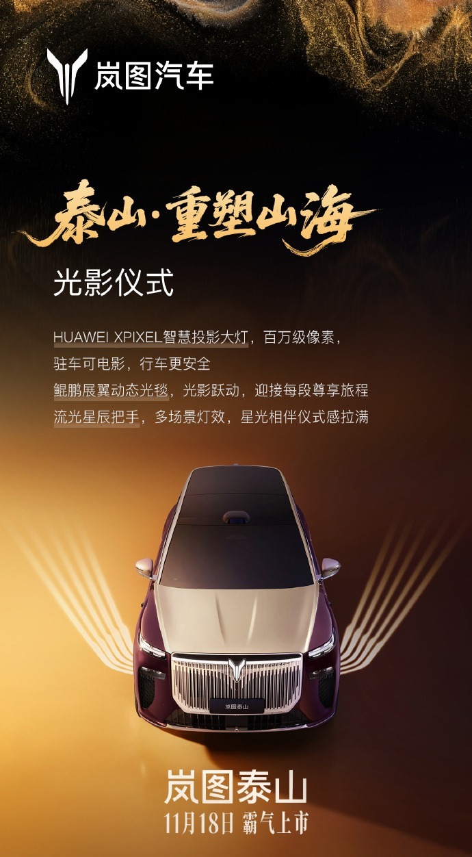 凤凰网科技讯 11月7日,岚图汽车官方宣布,岚图泰山11月18日上市,搭载华为乾崑智驾ADS 4、鸿蒙座舱5等,该车已于9月26日开启预订。