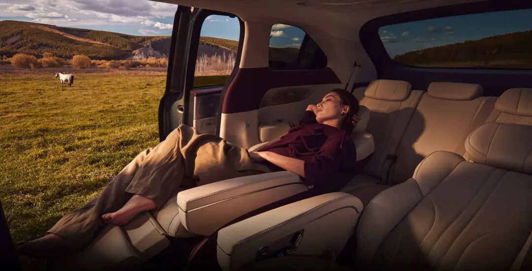 X9 提供四种座椅布局模式。七座状态下,三排均拥有超过 1 米的腿部空间,10 岁以下儿童可在车内站立行走;六座模式下,可轻松容纳三个 24 英寸行李箱、一辆轮椅和两台婴儿车;五座时,能装下五个行李箱加两辆儿童自行车;而一键电动收纳第三排后,可形成 2514 升的纯平储物空间——足以放下五辆成人自行车,甚至铺上 1.8×1.6 米的床垫变身露营床。
