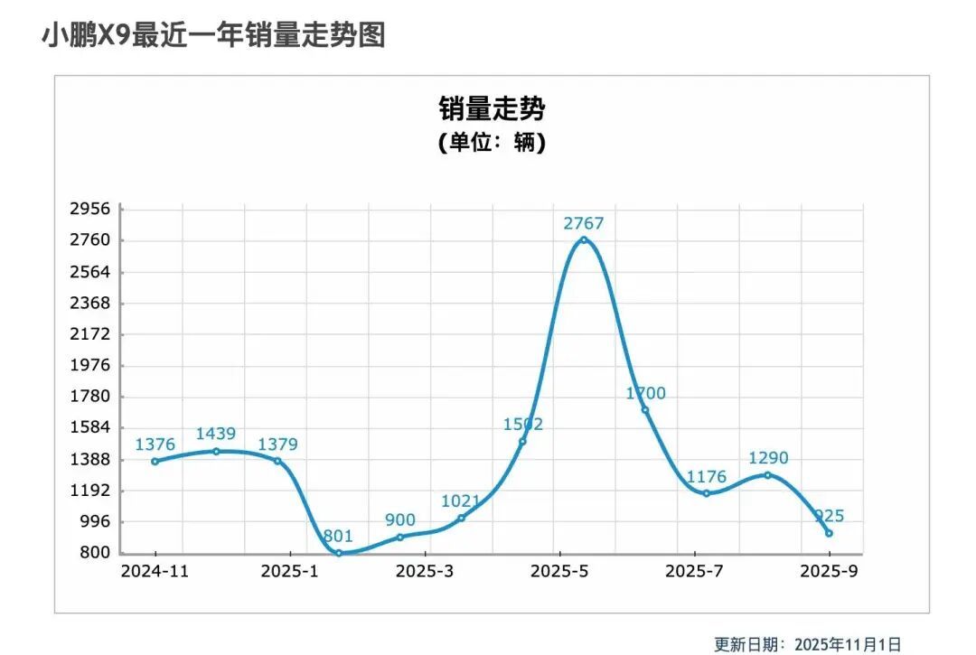 销量上的反馈则更明显一点,过去一年,纯电小鹏 X9 的最高月销量为 2767 台,更多的时候在千辆左右徘徊。
