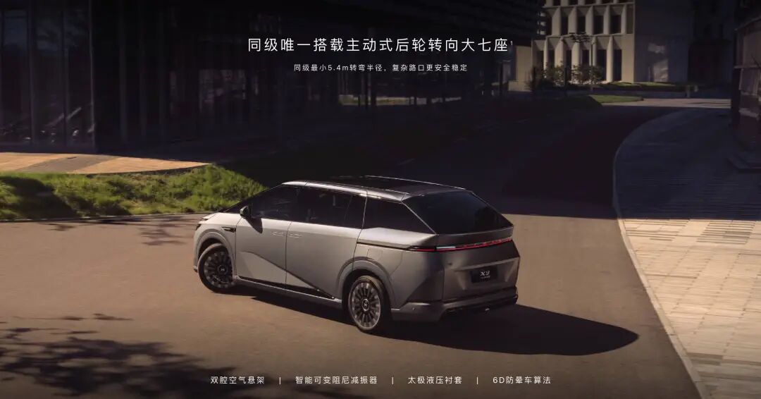 而在动态表现上,小鹏仅提到 X9 超级增程配备了主动式后轮转向系统,可实现最大 10 度后轮转角,将转弯半径压缩至 5.4 米,极大缓解了大型 MPV 在狭窄街道掉头或停车时的窘境。