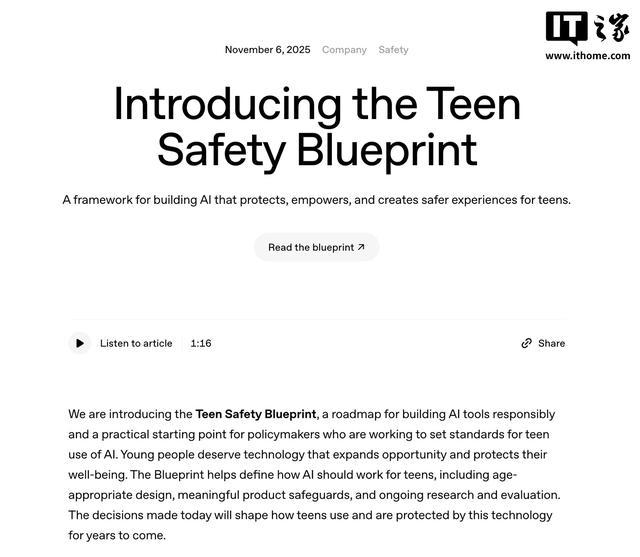 IT之家 11 月 7 日消息,北京时间今天凌晨,OpenAI 发布了“青少年安全蓝图”,旨在更有效地保护年轻用户免受伤害。这一新框架是在 ChatGPT 被指未能及时帮助心理困扰用户事件之后推出的。