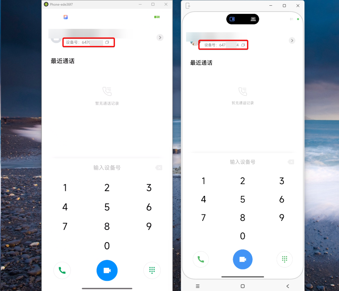 接着两台手机分别打开「小米通话」App,就能看到顶部所显示的设备码。