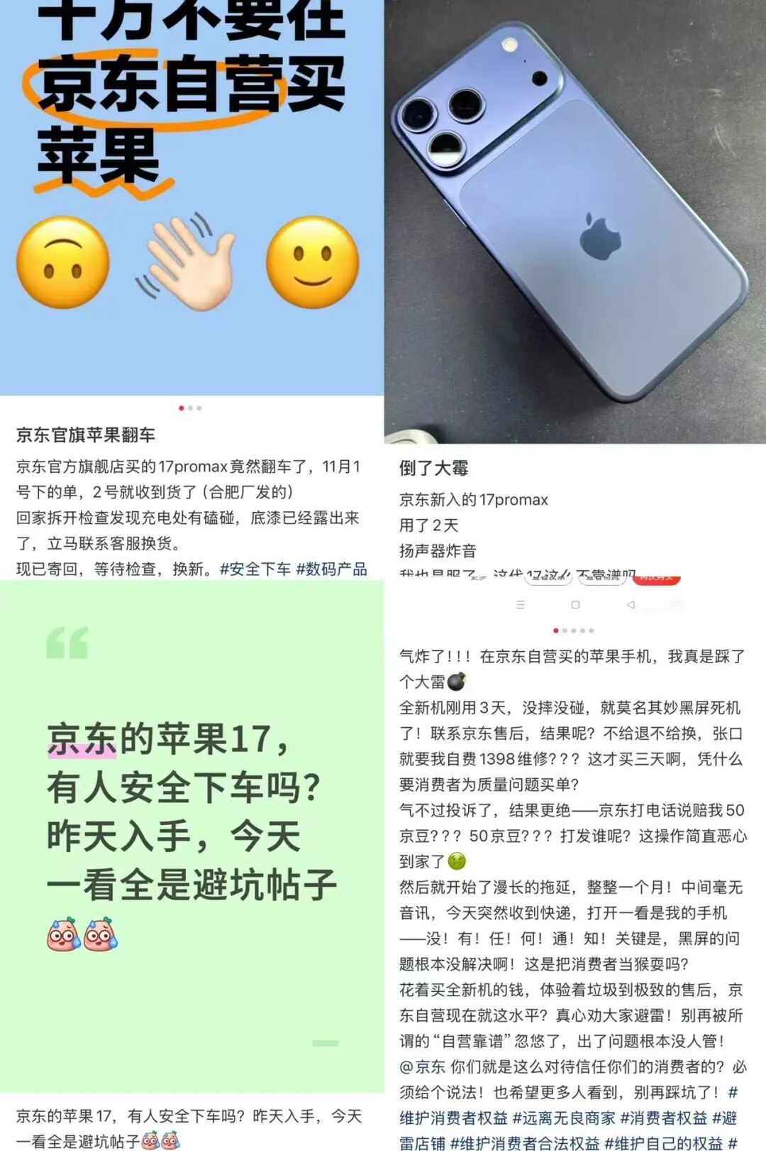 在社交媒体小红书上,用户关于在京东购买iPhone17出现质量问题,或者建议避雷京东的帖子随处可见。