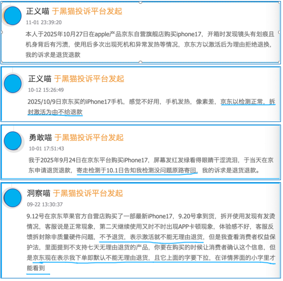 在消费者服务平台黑猫投诉上,随着iPhone17的交付,近期也密集出现了用户投诉在京东自营购买iPhone17存在质量问题遭遇维权难的帖子。