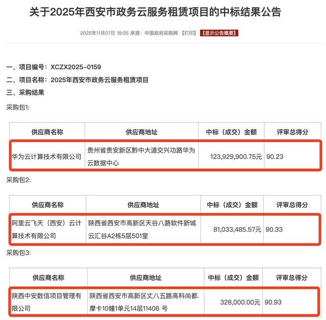 11月7日报道,今日晚间,西安市数据局发布关于“2025年西安市政务云服务租赁项目”的中标结果公告,两大云计算巨头华为云和阿里云都竞得了部分项目,项目金额分别为1.2亿元、8103万元。