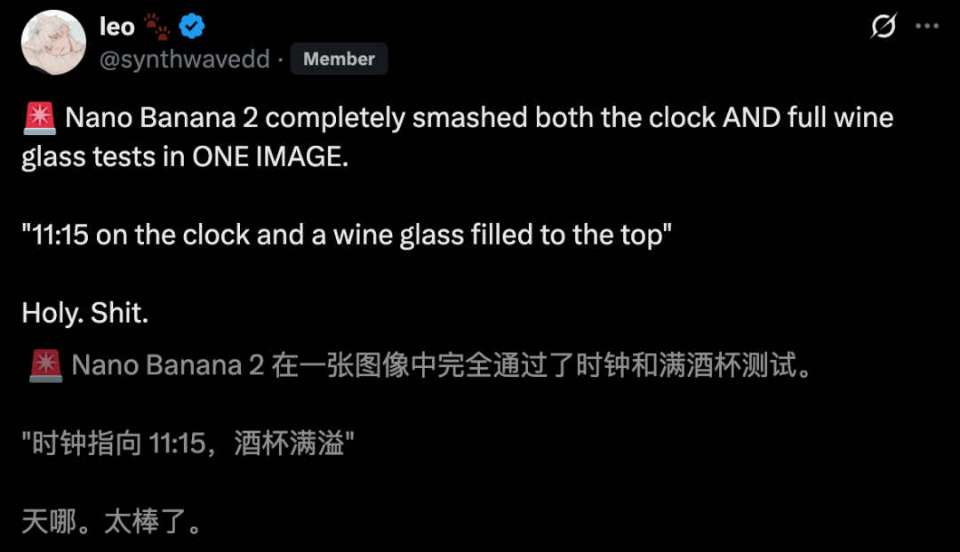 没想到,Nano Banana 2可以在一张图中,一次性通过了「时钟」和「满杯红酒」的测试。